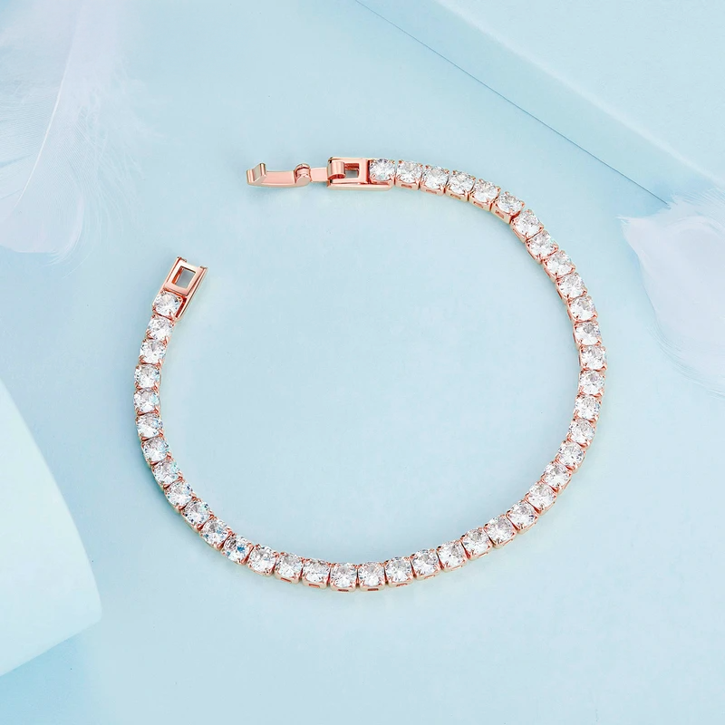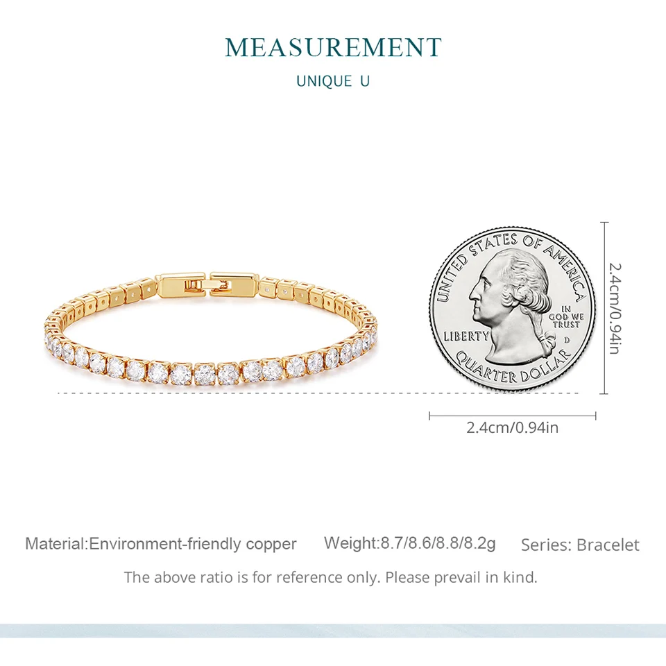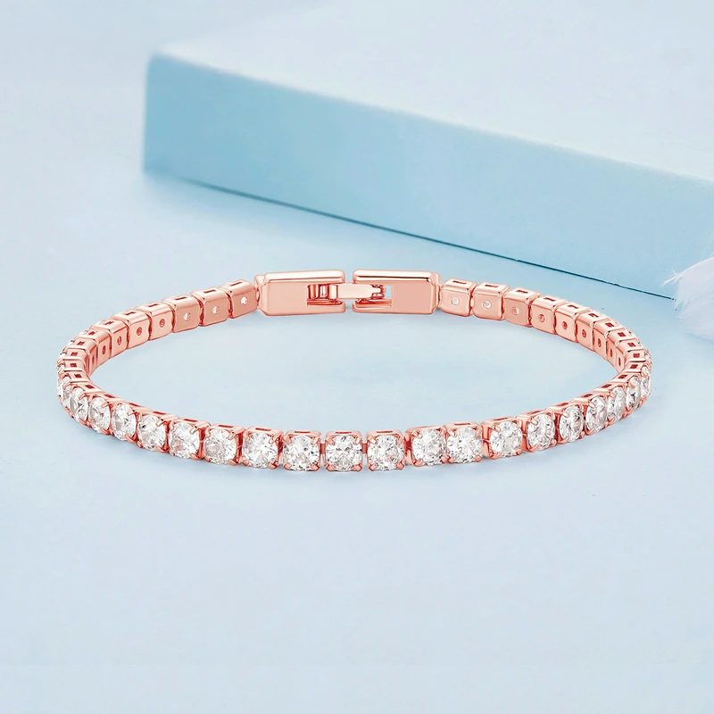 Elevate your wrist game with our Blushing Tennis Bracelet. A continuous line of sparkling round-cut crystals is set in lustrous gold-plated sterling silver, catching light with every movement. The sleek box clasp with a safety latch ensures a secure, comfortable fit, while the timeless design makes it perfect for both everyday wear and special occasions. Pair it with matching gold studs or stack it alongside our coordinating bangles for a chic, layered look that’s sure to turn heads.