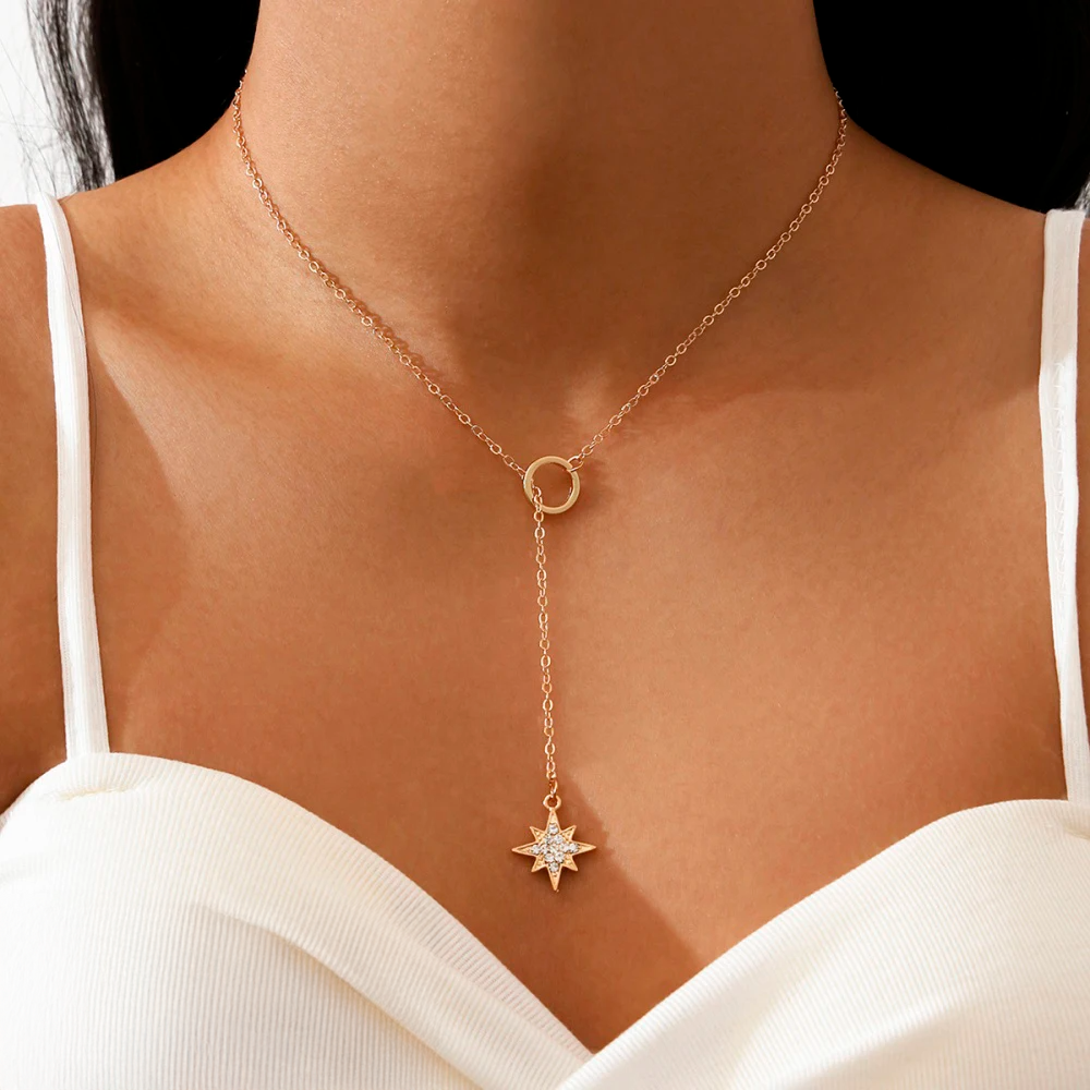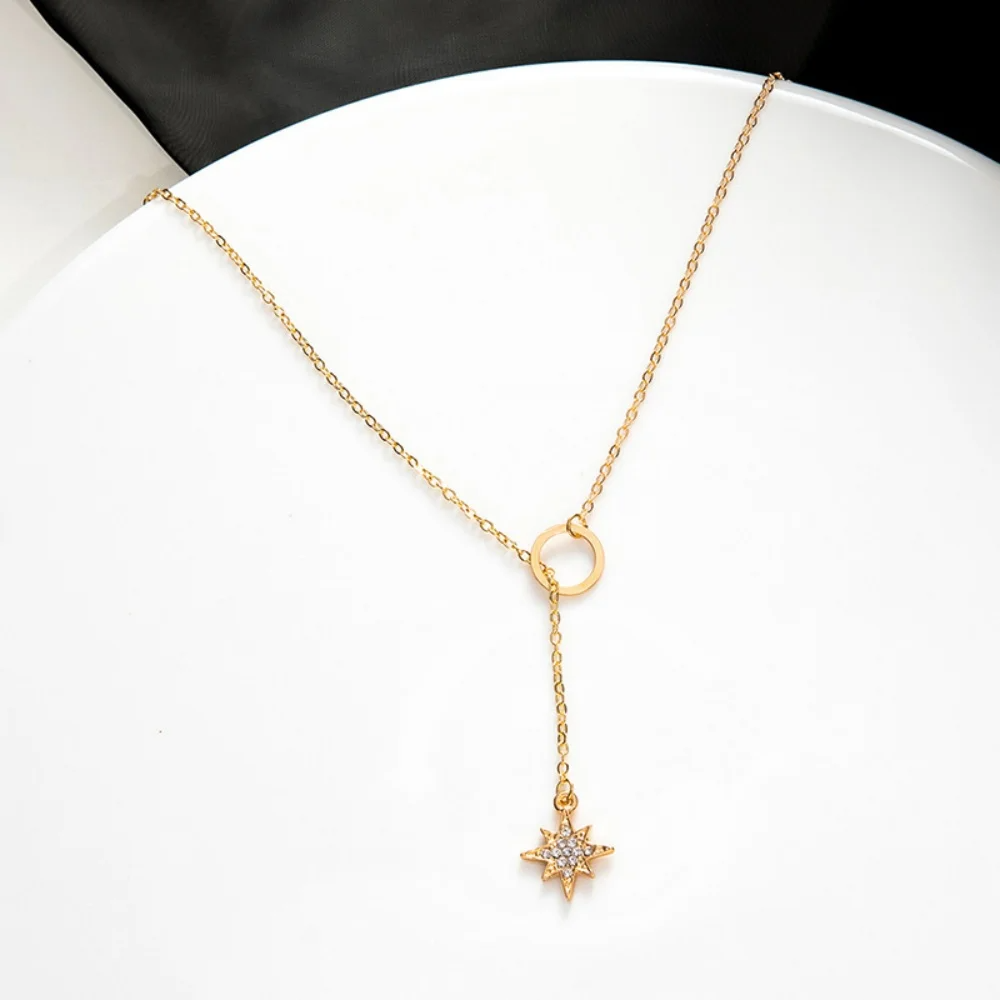 Let your inner light shine with the Celestial Drop Star Necklace — a delicate lariat design that captures the wonder of the night sky. A sparkling star pendant gracefully falls from a golden ring, adding a dreamy, ethereal touch to any look. Perfect for stargazers and daydreamers alike, this piece brings just the right amount of shimmer and symbolism.