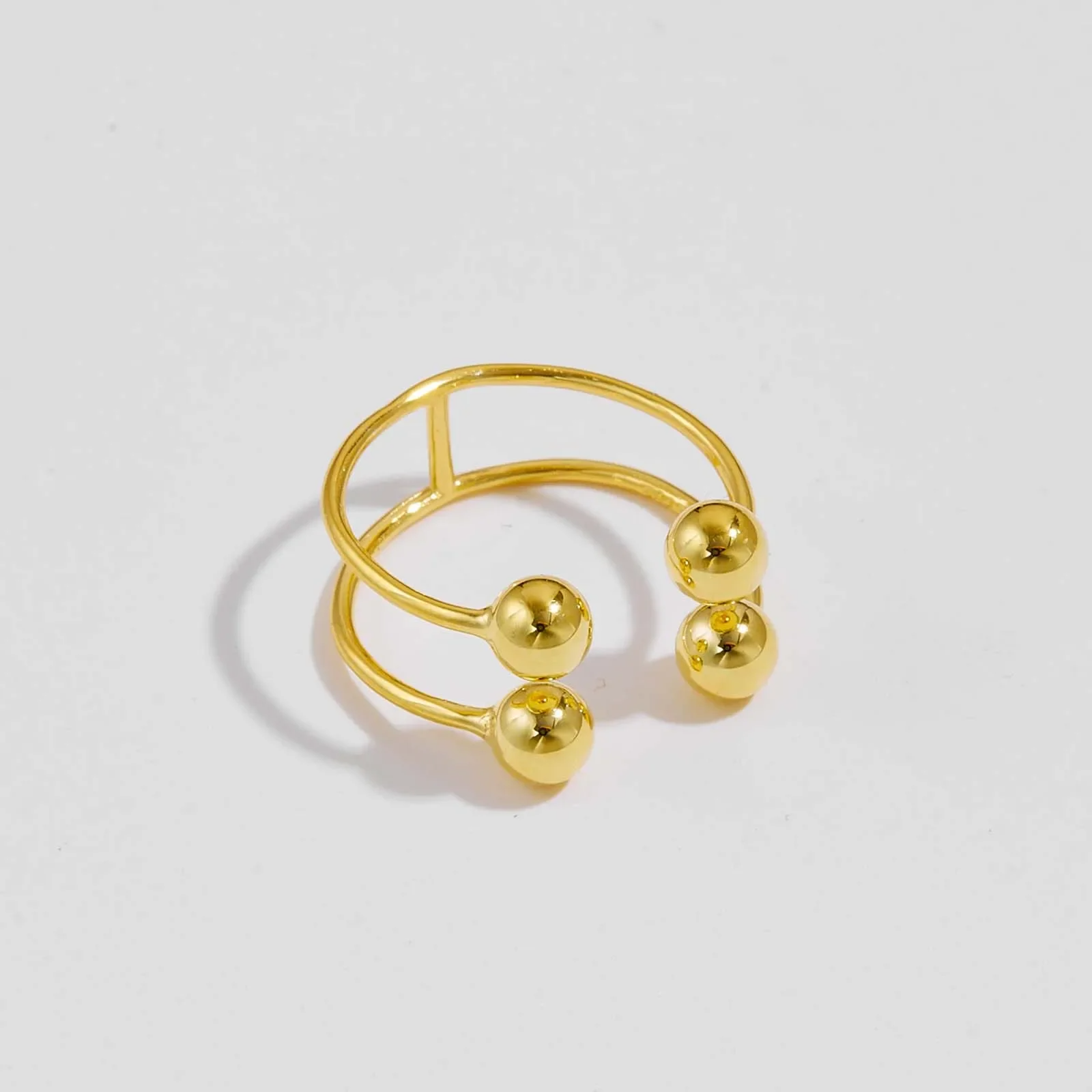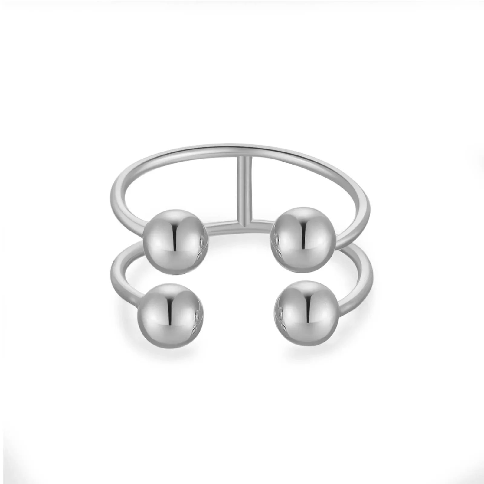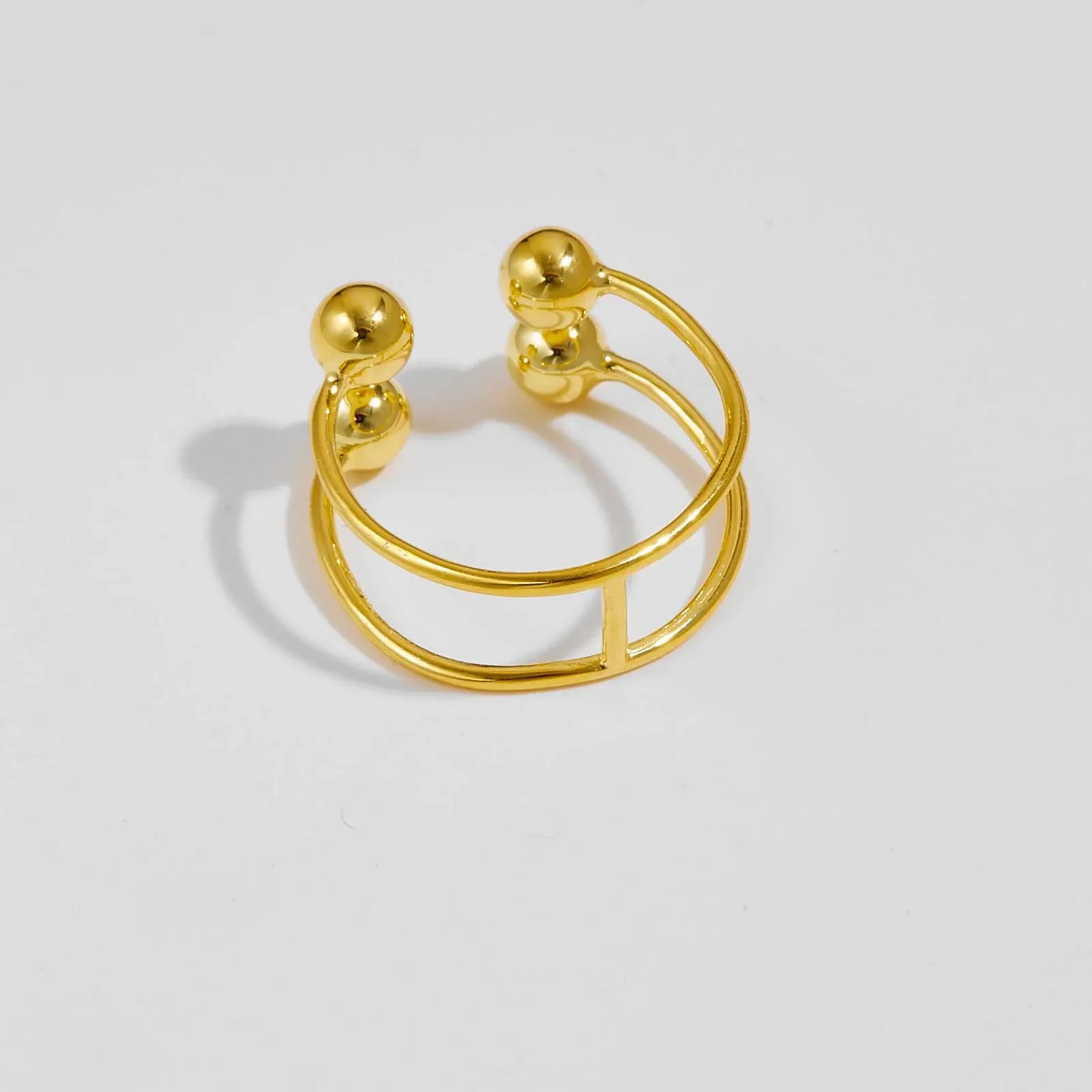 Dual Orbit Sphere Ring – sculptural open silhouette with two parallel bands merging into four polished spheres that hover at each end. Its adjustable design offers a custom fit and a striking, modern statement. Wear it solo for architectural flair or pair with minimal bands for a chic layered effect.