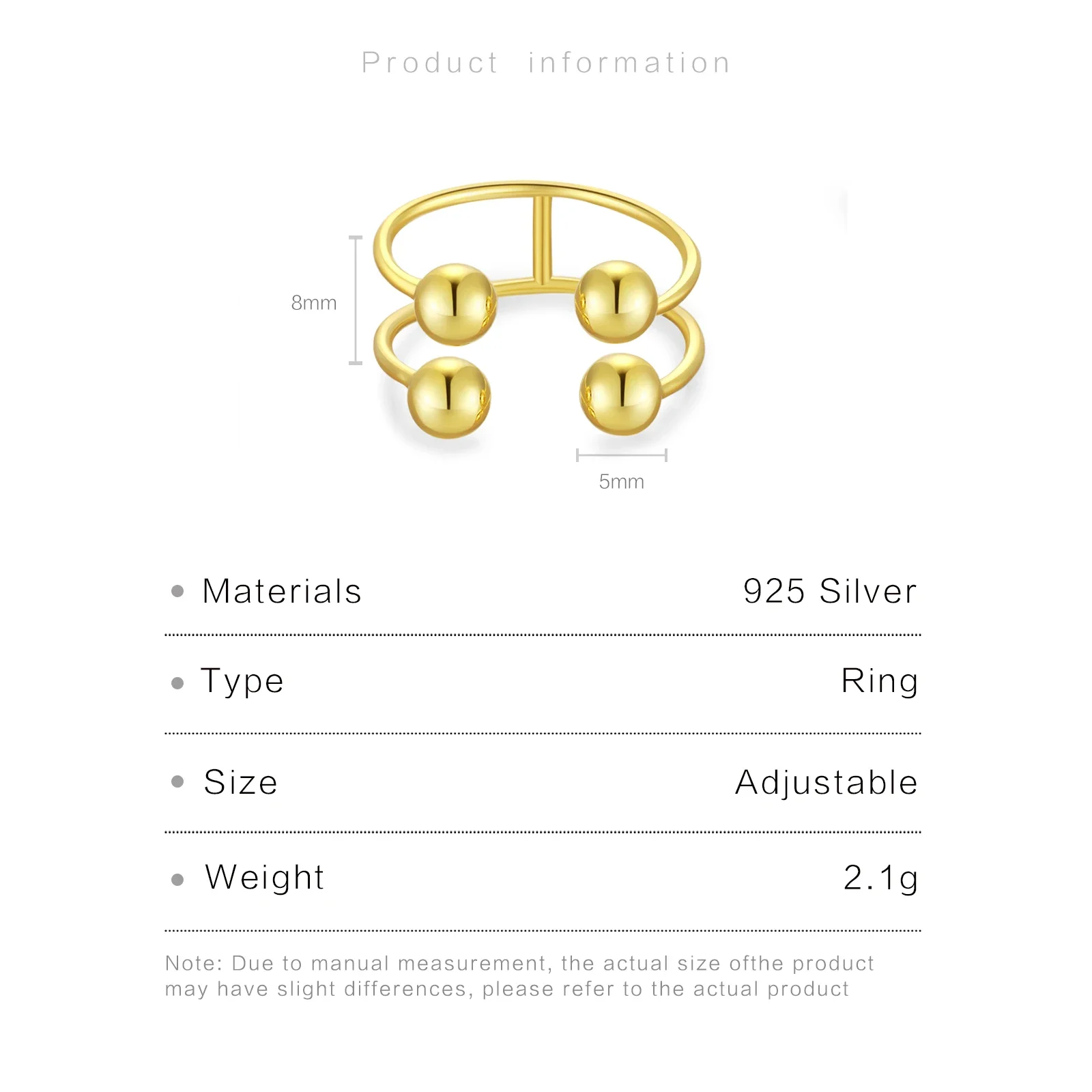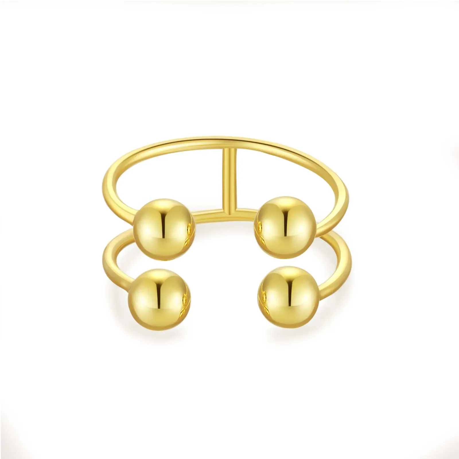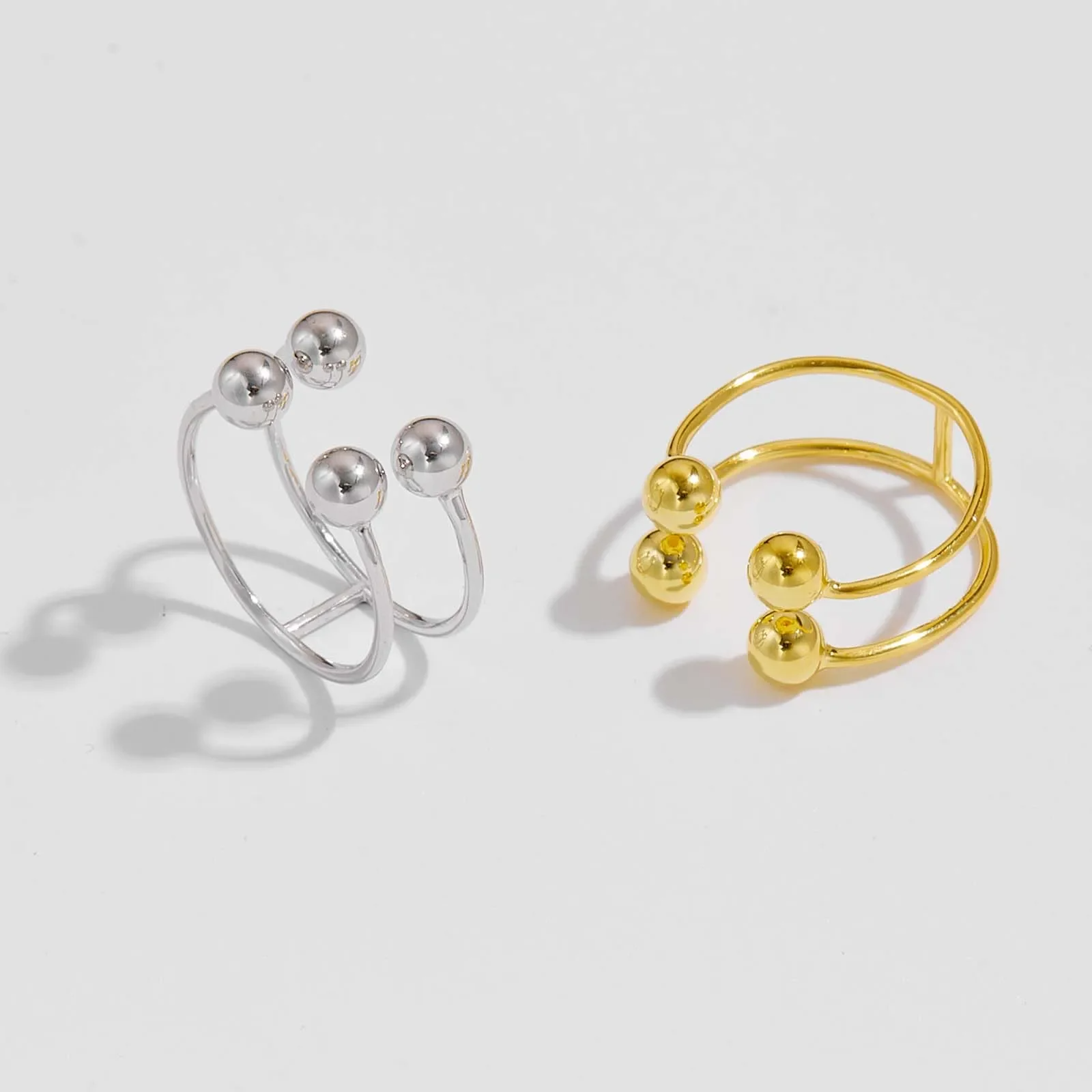 Dual Orbit Sphere Ring – sculptural open silhouette with two parallel bands merging into four polished spheres that hover at each end. Its adjustable design offers a custom fit and a striking, modern statement. Wear it solo for architectural flair or pair with minimal bands for a chic layered effect.