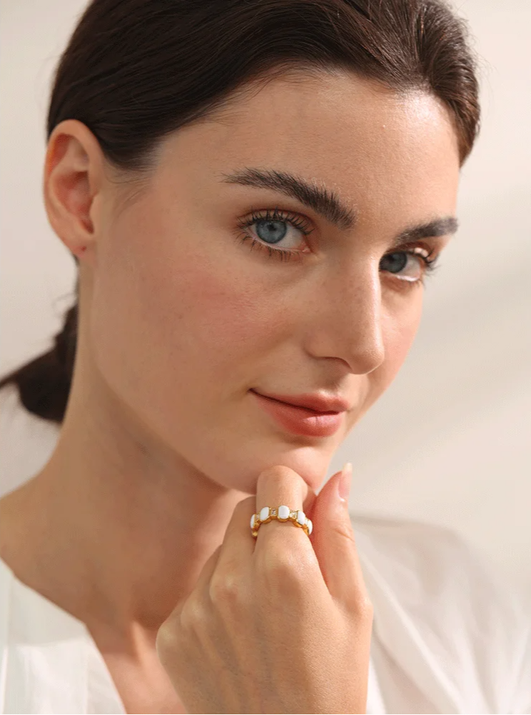 A chic gold-tone ring crafted from alternating white enamel squares and polished metal links, creating a modern mosaic effect that wraps elegantly around the finger. Each smooth enamel panel is thoughtfully set between gleaming gold frames, lending a crisp contrast that catches the eye. Its open-ended, adjustable design ensures a comfortable fit and allows for easy styling – wear it solo for a minimalist statement or stack it with other favorites to elevate any look with artful detail and contemporary flair.