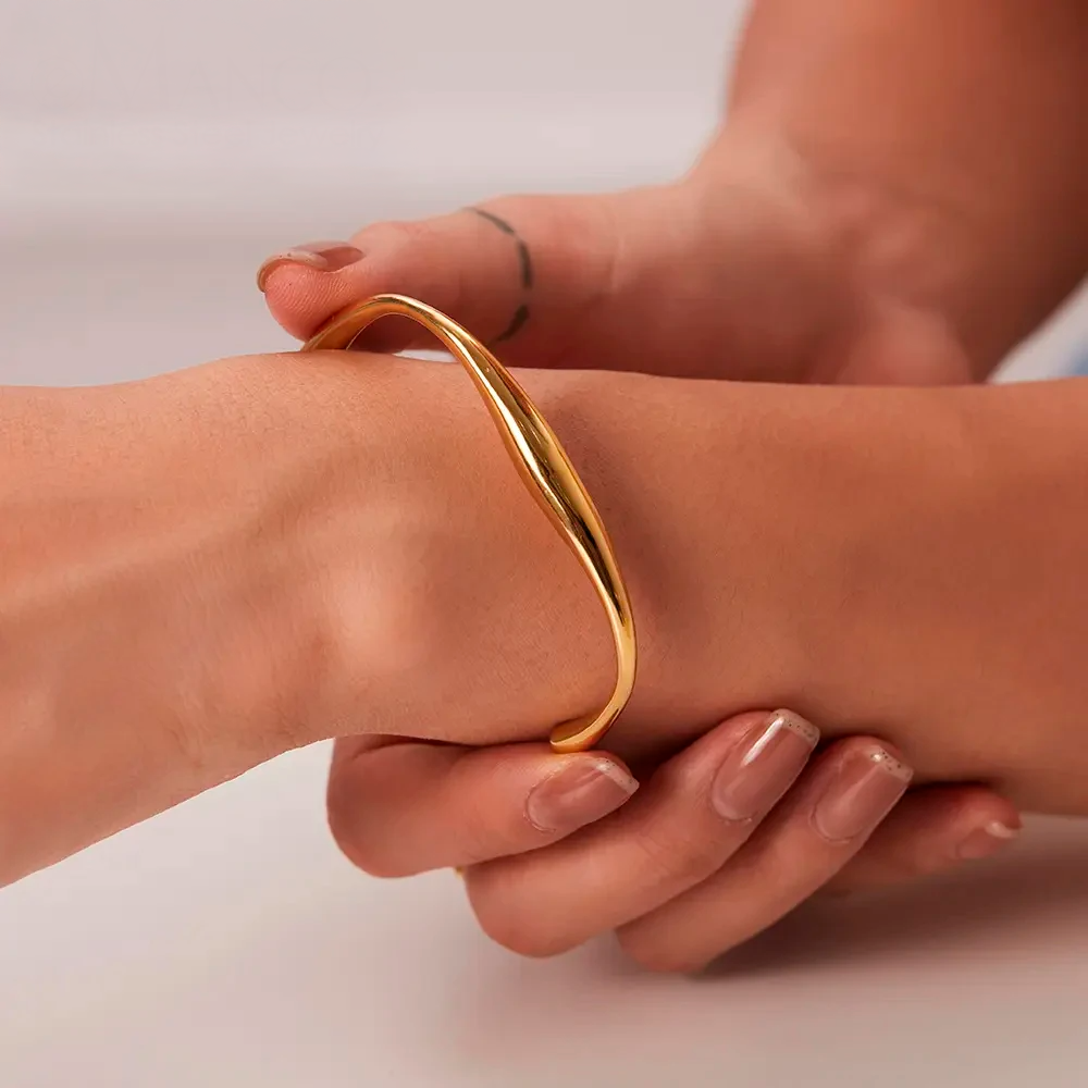Inspired by nature’s gentle currents – the Fluid Wave Cuff Bracelet features a sleek, open silhouette that wraps gracefully around the wrist. Its seamless twist evokes a sense of movement and modern sophistication – perfect for wearing solo or layered with other bangles. The polished finish catches light from every angle, making a statement of understated elegance whether you choose the cool glow of silver or the warm shimmer of gold.