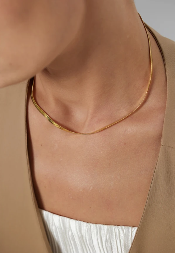 Crafted with a sleek herringbone link design this gold-plated necklace offers a smooth reflective surface that drapes gracefully around the neck. Its fluid silhouette catches the light with every movement creating a subtle gleam that elevates both casual and formal attire. Perfect for layering or wearing alone this timeless piece adds polished sophistication to any look.
