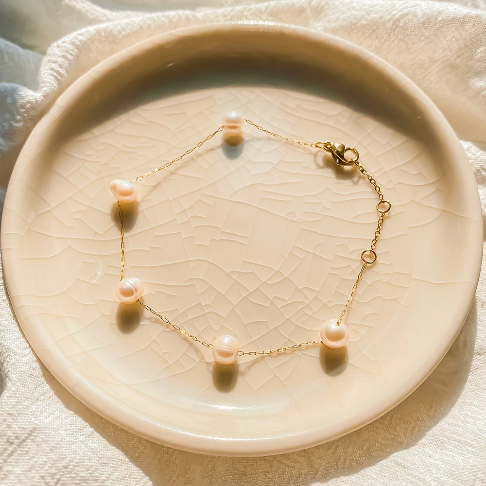 A delicate chain studded with creamy white pearls – this timeless piece catches the light with every movement. Each pearl seems to float along the slender golden strand – creating a look that’s both refined and effortlessly chic. Wear it alone for quiet elegance, or layer it with other bracelets to let the pearls peek through your stack – either way, it adds a soft, feminine touch to any outfit.