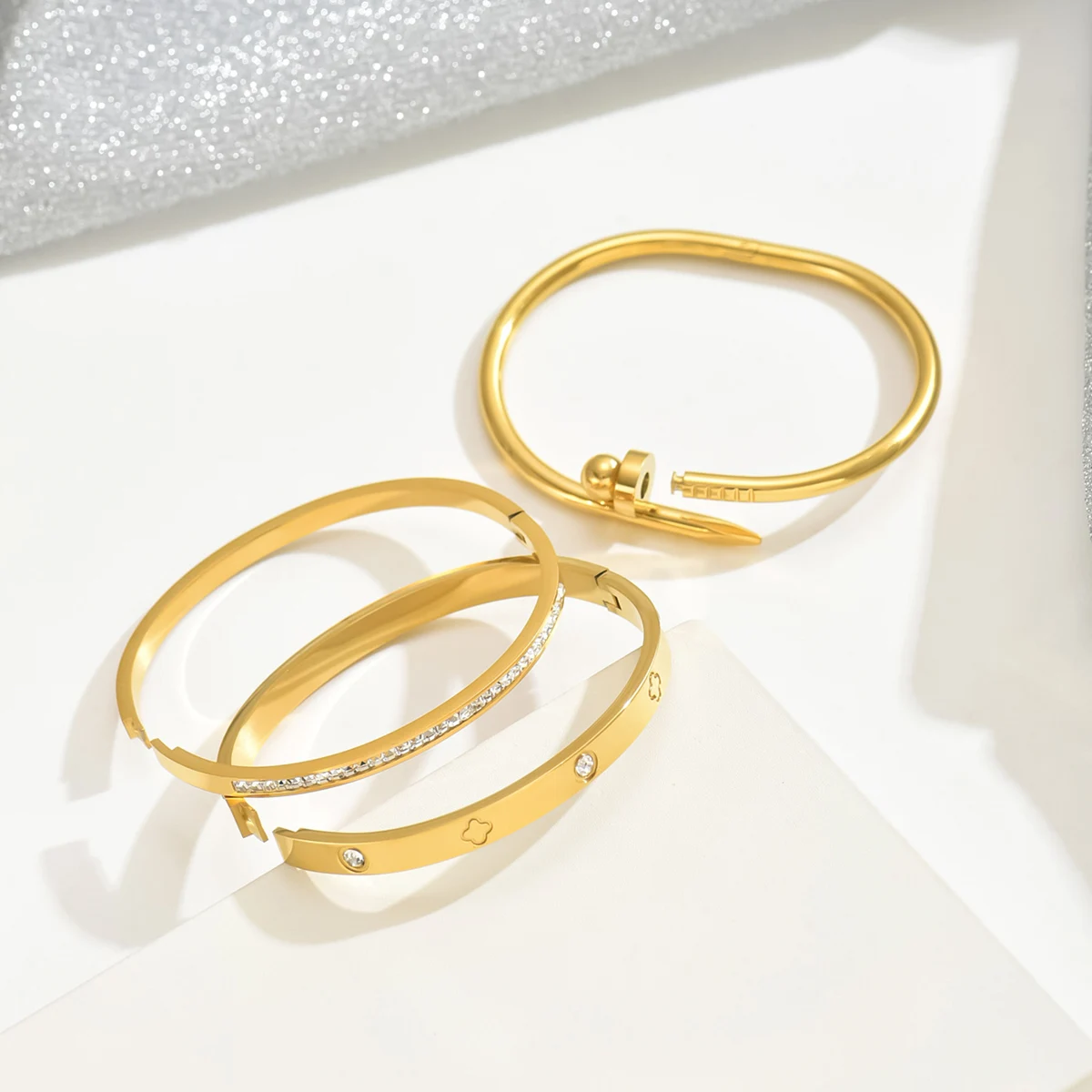 Elevate your stack with our Golden Radiance Bangle Set—three distinct bangles crafted from lustrous 18K gold-plated sterling silver. Each piece offers its own statement: a bold nail-inspired cuff with a sculptural silhouette; a slim, channel-set cubic zirconia bangle that shimmers like micro-pavé; and a polished, slim-band bangle dotted with sparkling stones and subtle quatrefoil cutouts. Together, they create a harmonious trio that catches the light from every angle.