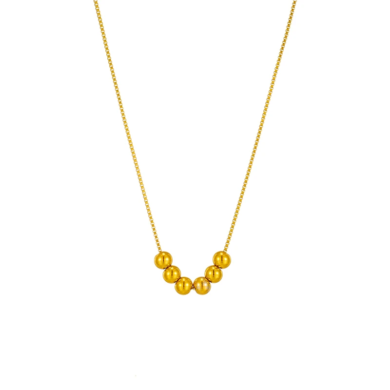 A sleek gold-plated chain featuring six polished spheres arranged in a graceful curve – each bead catches light for a subtle, reflective glow that accents the neckline. This minimalist pendant sits just below the collarbone, offering versatile elegance for everyday wear or special occasions. Crafted to complement any outfit, the balanced row of spheres creates a modern look that adds warmth and refinement to your style.