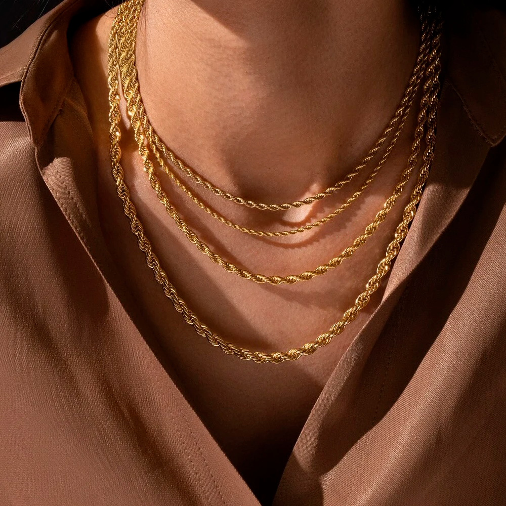 This exquisite necklace set features two intertwining rope chains – one subtly slender and one luxuriously bold – nestled together to create a balanced, layered look. Each chain is meticulously crafted in a warm golden hue, its twisted links catching light with every movement. Worn alone or paired with other pieces, this adds a refined yet dynamic accent that flatters any neckline, making it a versatile statement of understated glamour.