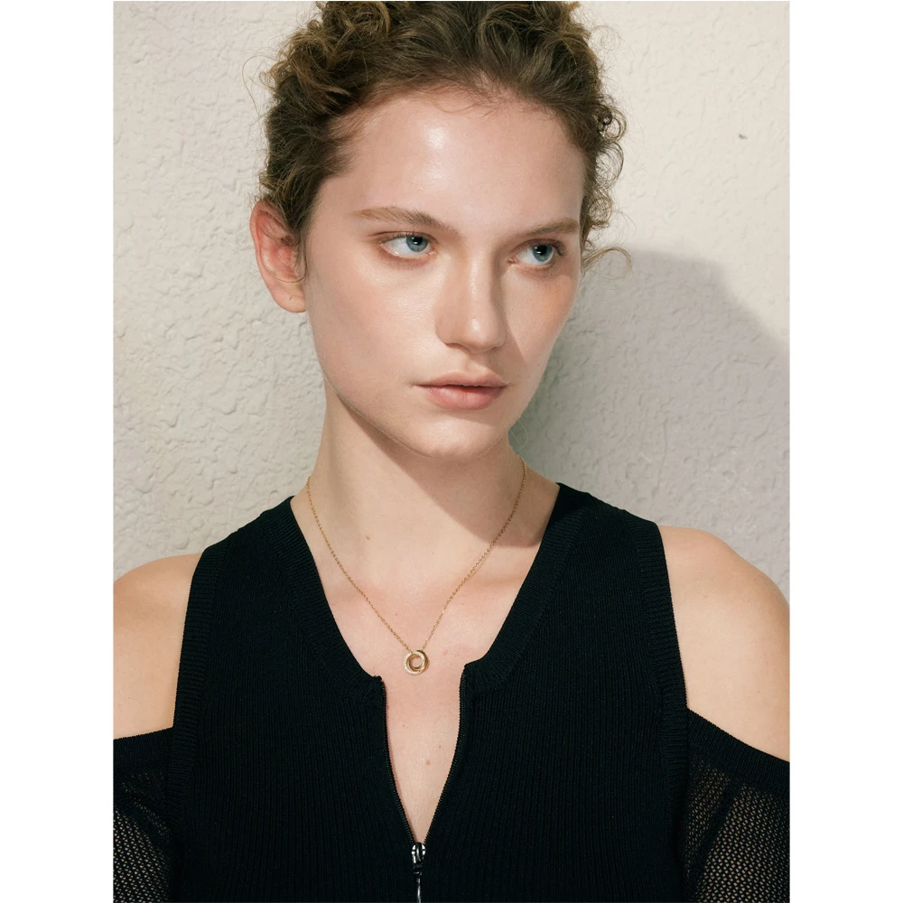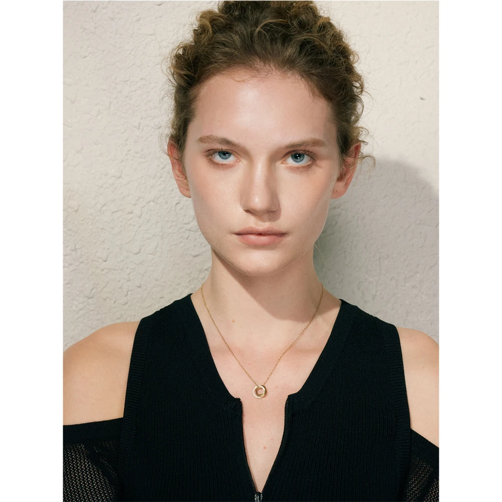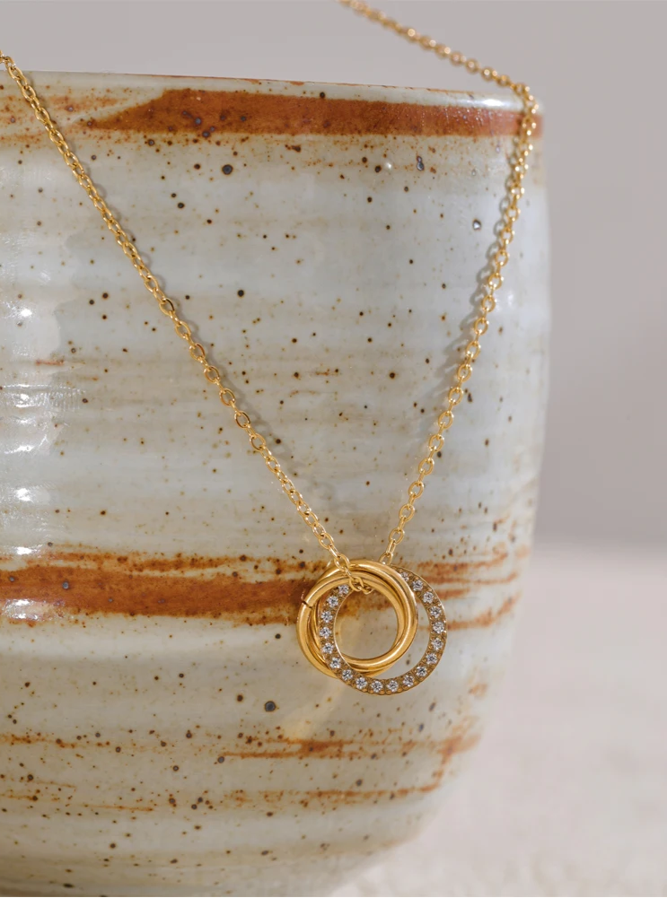 A delicate gold-plated chain – featuring three interlocking circles that rest elegantly at the collarbone – where one circle glimmers with cubic zirconia accents and the others shine in smooth, polished metal. The layered rings catch light from every angle, creating a timeless focal point that elevates both casual and evening looks. This versatile piece makes a thoughtful gift or a chic everyday accent, embodying modern sophistication in a simple yet striking design.