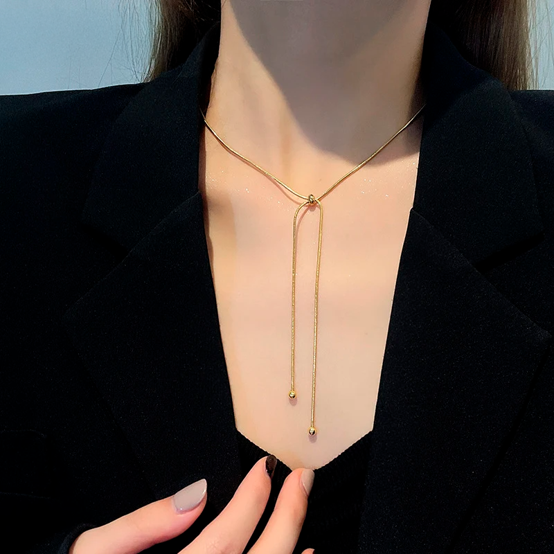 Effortlessly chic and endlessly versatile, this necklace features a sleek snake chain that loops through a polished slider bead – creating a graceful lariat silhouette that can be adjusted to suit any neckline. The two slender chains cascade elegantly, each tipped with a tiny bead that catches the light with every movement. Whether styled as a subtle accent under a blouse or as a statement piece against an evening dress, this design adds refined modernity and ease to any look.