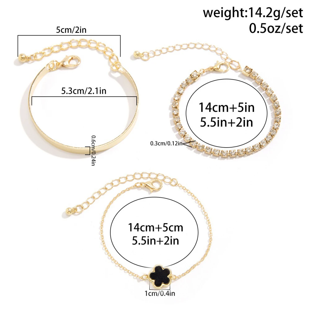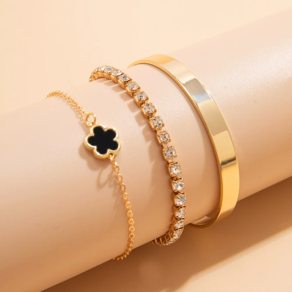 A trio of elegant bracelets designed to mix and match: a sleek polished cuff, a sparkling crystal chain, and a delicate clover charm on fine gold links. Together they balance bold shine, refined sparkle, and subtle charm for a timeless layered look.