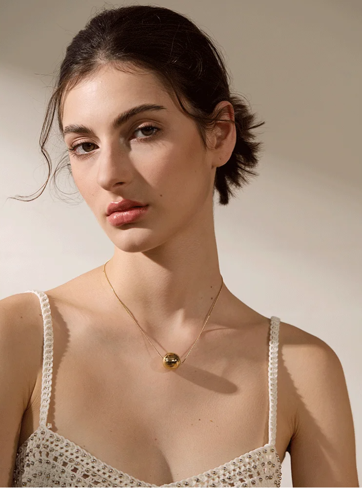 A single gleaming golden orb appears to float effortlessly at the center of a slender, snake-style chain, its smooth, reflective surface catching light with every movement. The simplicity of its design allows the luminous sphere to take center stage, creating a modern yet timeless statement that complements both casual and dressier looks. Suspends gracefully at the collarbone, this necklace’s understated elegance makes it an effortless addition to any collection, infusing every ensemble with a touch of sleek refinement.