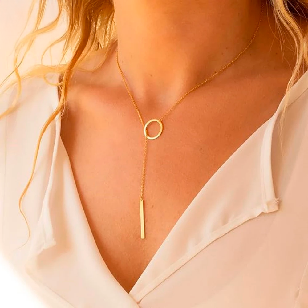 Elevate your neckline with the refined balance of our Solstice Drop Lariat Necklace. Featuring a polished golden circle paired with a slender vertical bar, this Y-shaped silhouette exudes minimalist elegance and quiet confidence. Whether worn solo or layered, it's a graceful reminder that beauty lies in simplicity and symmetry.
