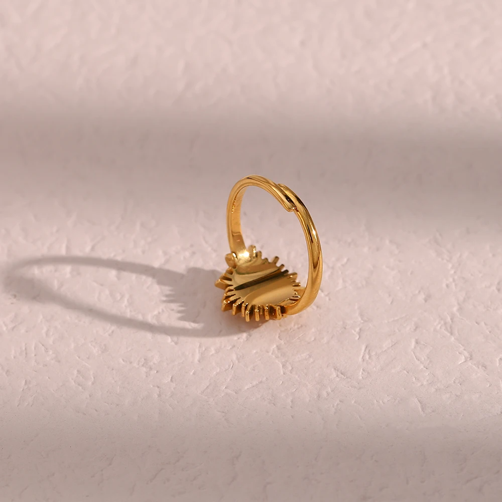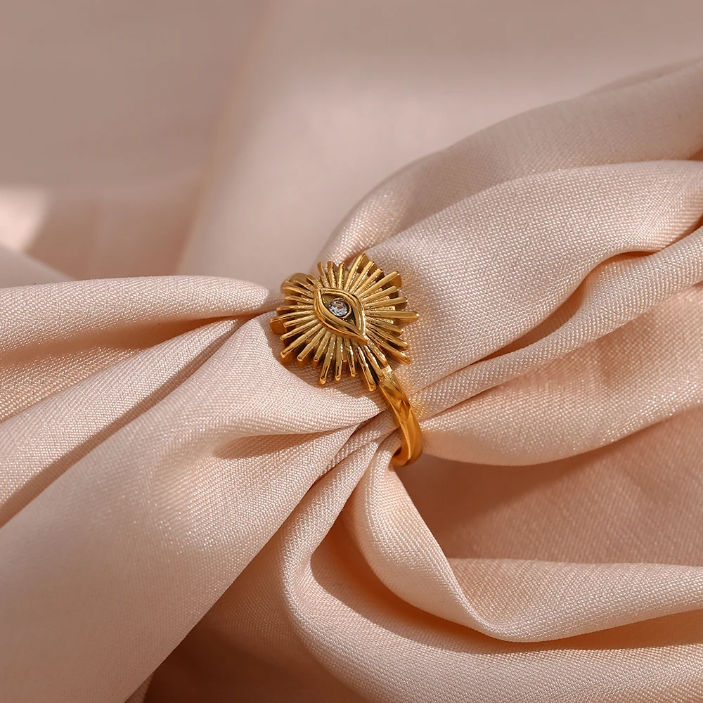 Elevate your look with this Sunburst Eye Statement Ring – a captivating gold-tone band detailed with a radiant sunburst of sculpted rays that frame an exquisitely carved eye motif – at the heart of the eye sits a single sparkling crystal that catches every glimmer of light – its bold yet elegant design brings a touch of mystique and modern glamour to any outfit, whether worn solo for maximum impact or stacked with other rings to express your unique style.